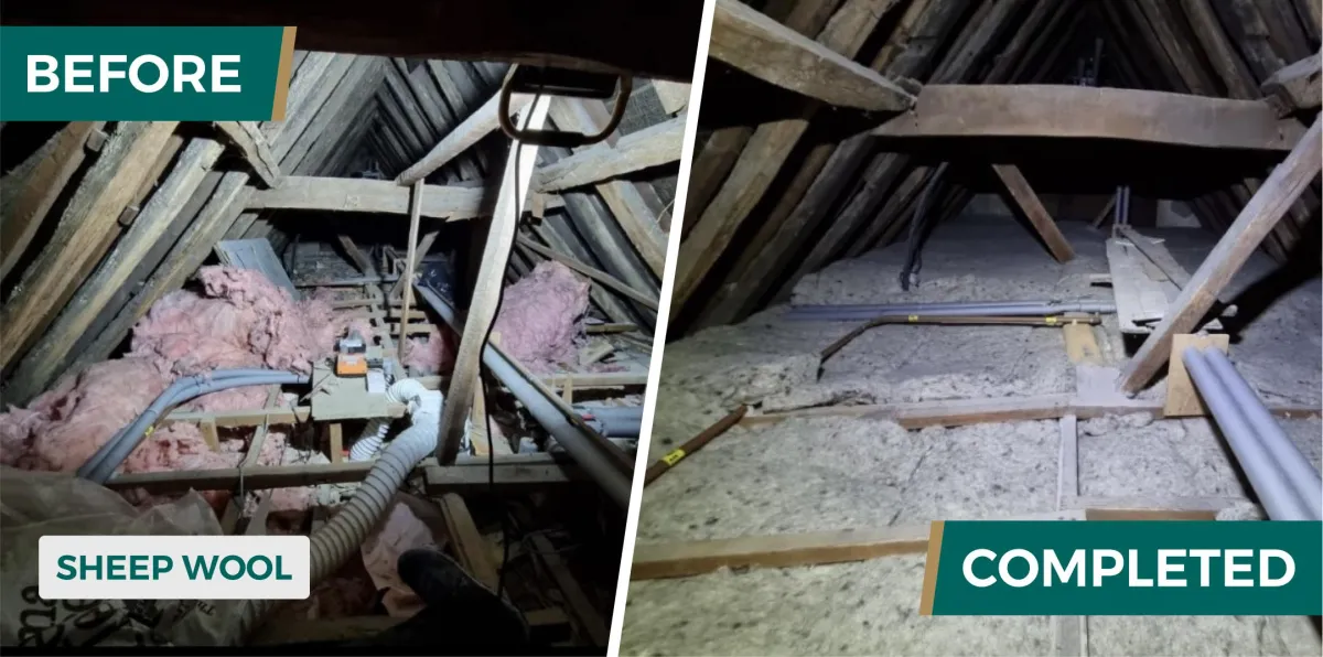 We dutifully removed the old material and disposed of it in a skip. After cleaning and hoovering the entirety of the loft, we then installed 240mm of Sheep Wool insulation. Our team included eaves ventilation points to create a natural airflow to the loft. The property was left in a much tidier condition than when we arrived - with a pleased customer enjoying regulated temperatures within!
