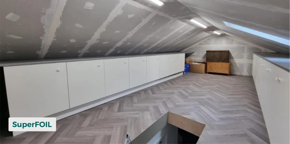 To begin, we applied SuperFOIL insulation within the loft space, enhancing its thermal efficiency. Next, we installed insulated plasterboard on top of the SuperFOIL to not only improve insulation but also provide an attractive finish to the ceiling.